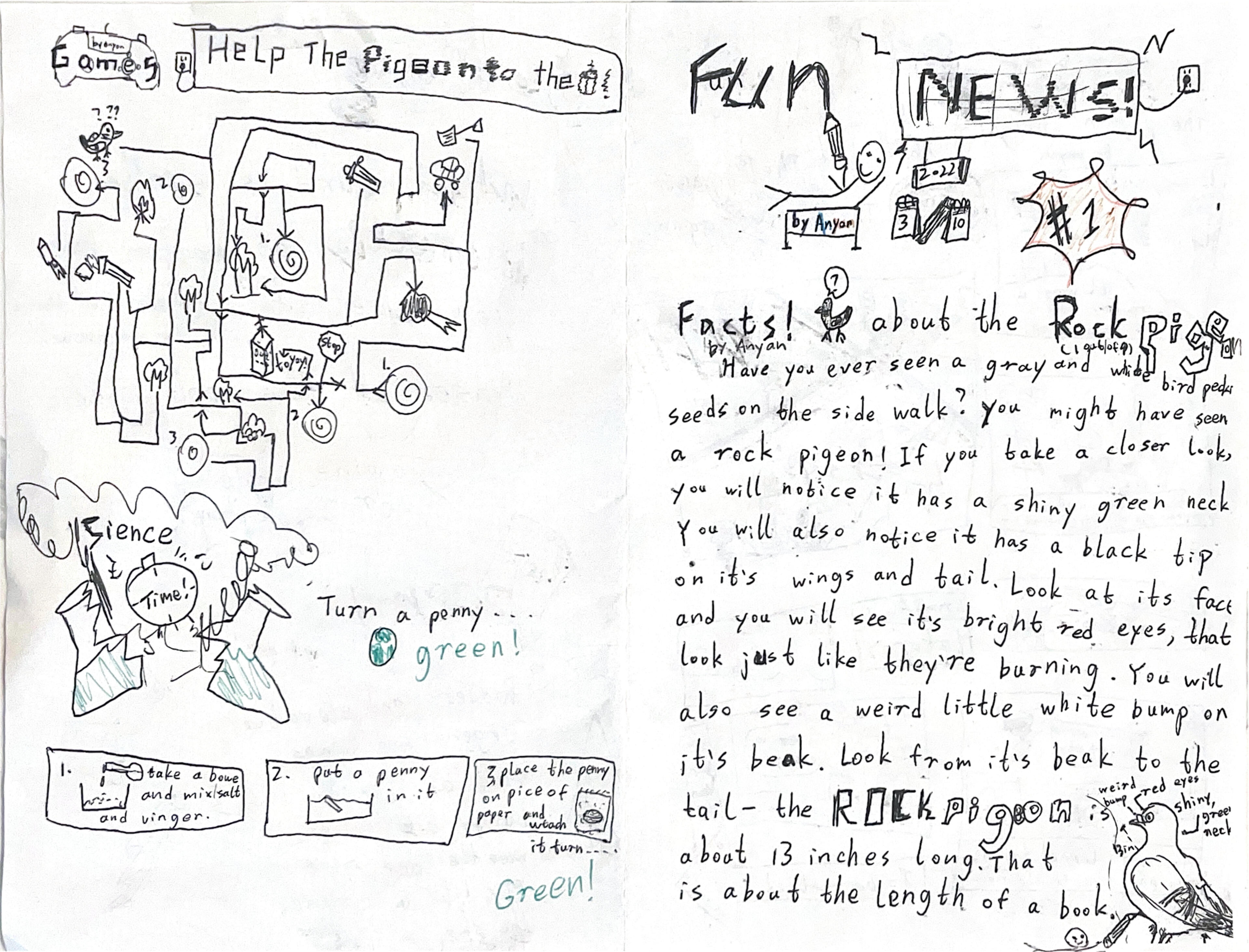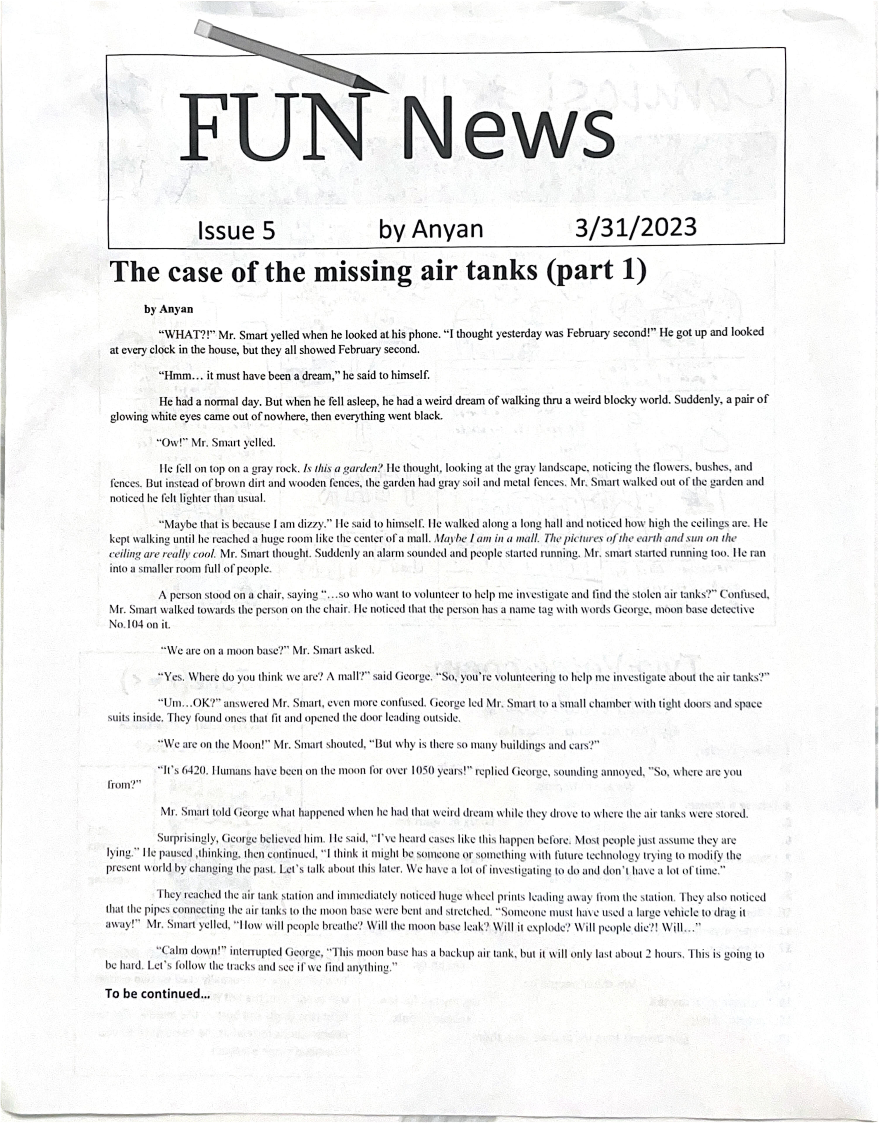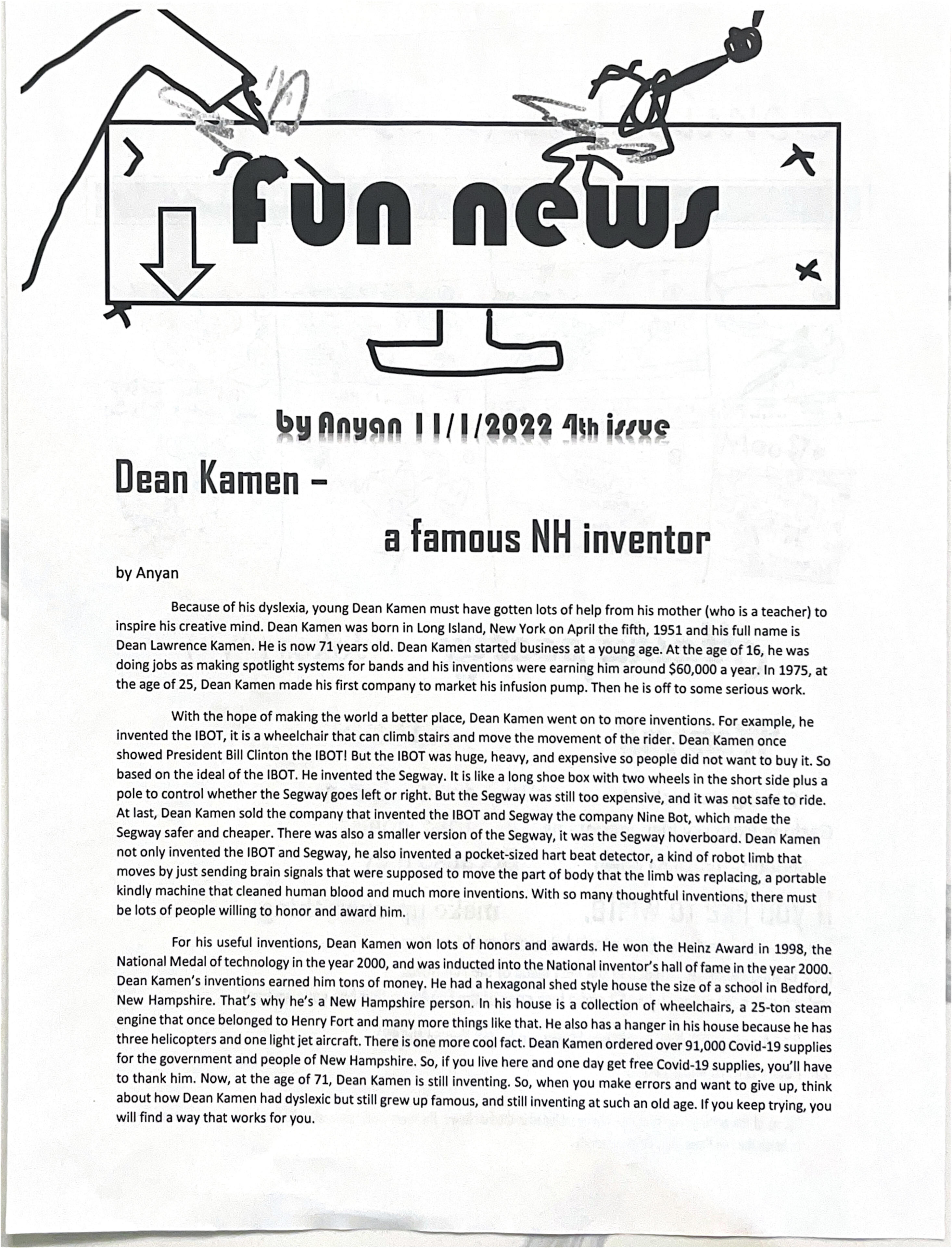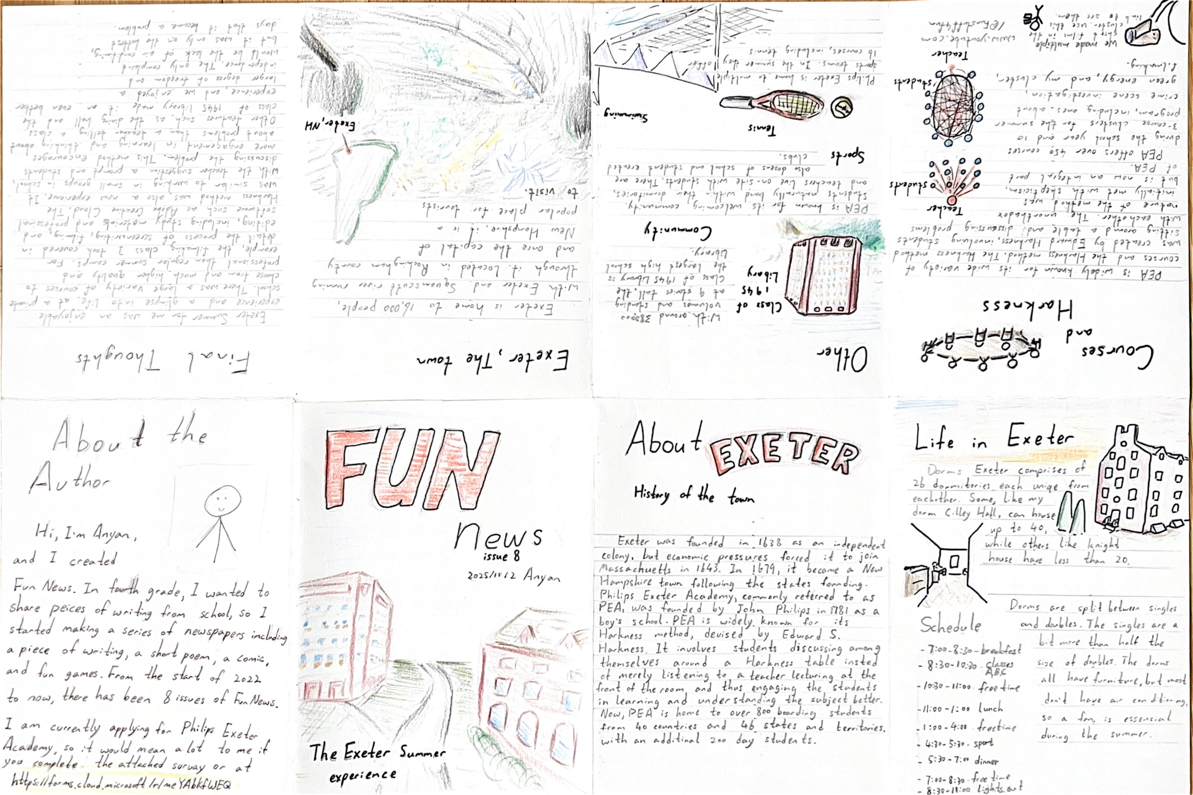 Fun News was created when I first moved to the US in fourth grade. During fourth grade, I seen and heard about stuff I haven't even dreamed about in China, such as books and stories with people selling newspapers. Fueled by this knowledge and eagerness to connect with the community, I made my own newspaper, Fun News. I began by going around the neighborhood and selling it door by door. In Fun News 3, I improved the news by digitally designing the front page, improving clarity and legibility. In Fun News 5 and 6, I experimented with a subscription model, including a long story split between the two issues and selling them as bundle then delivering the news separately to improve efficiency. For a while after Fun News 7 in 2023, I didn't release any more Fun News issues, because by that time schoolwork had increased and I was also enrolled in other after school programs, such as robotics and swimming. Just recently, however, I decided to make a new Fun News when met with an assignment in class to make a zine, which is a hand drawn magazine. This time, Fun News 8 featured 8 pages of colored drawings and detailed my experiences at Exeter summer. I went on to deliver the news, walking to each house just as I did 4 years ago, only with greater experience and dreams.